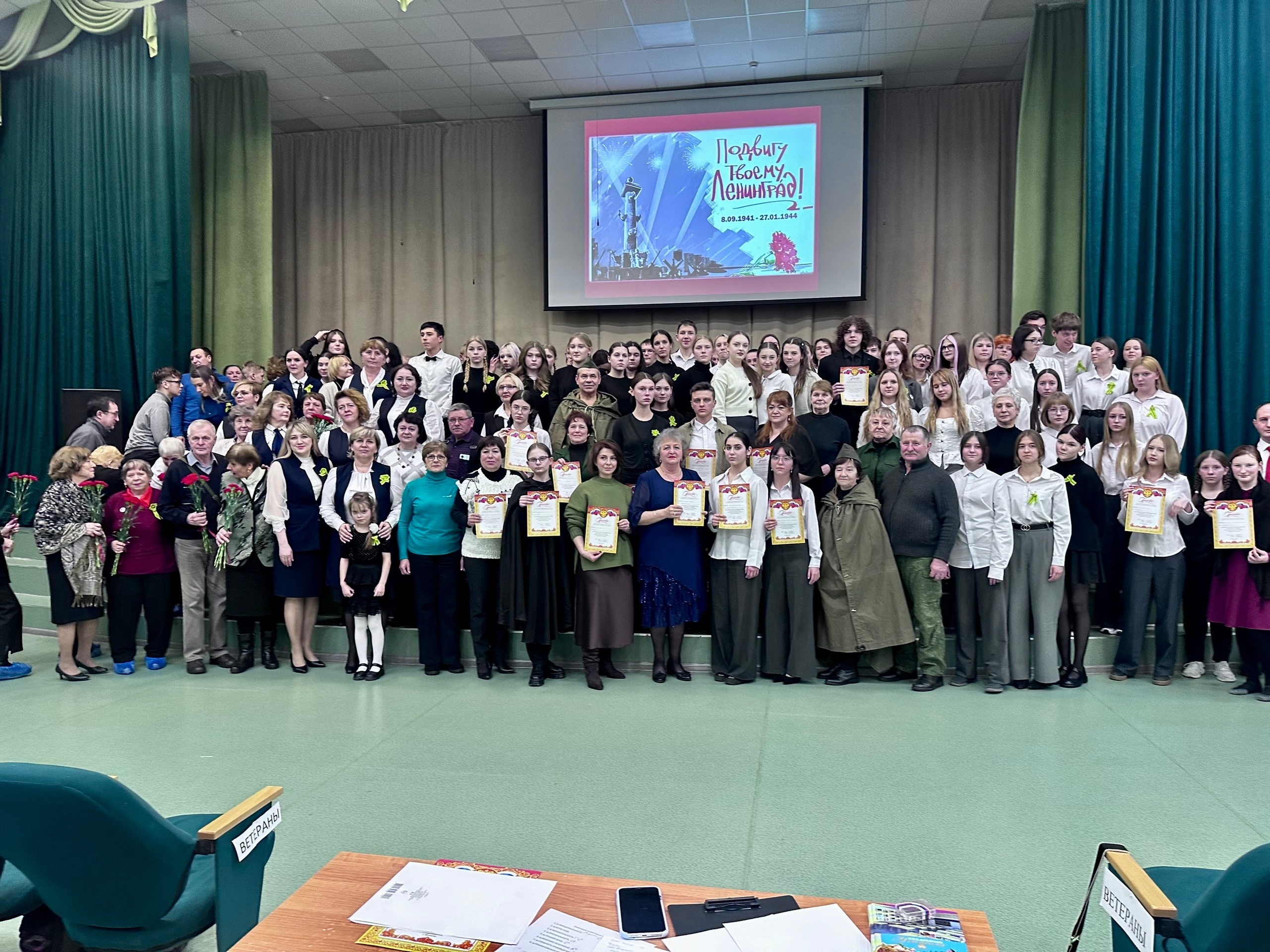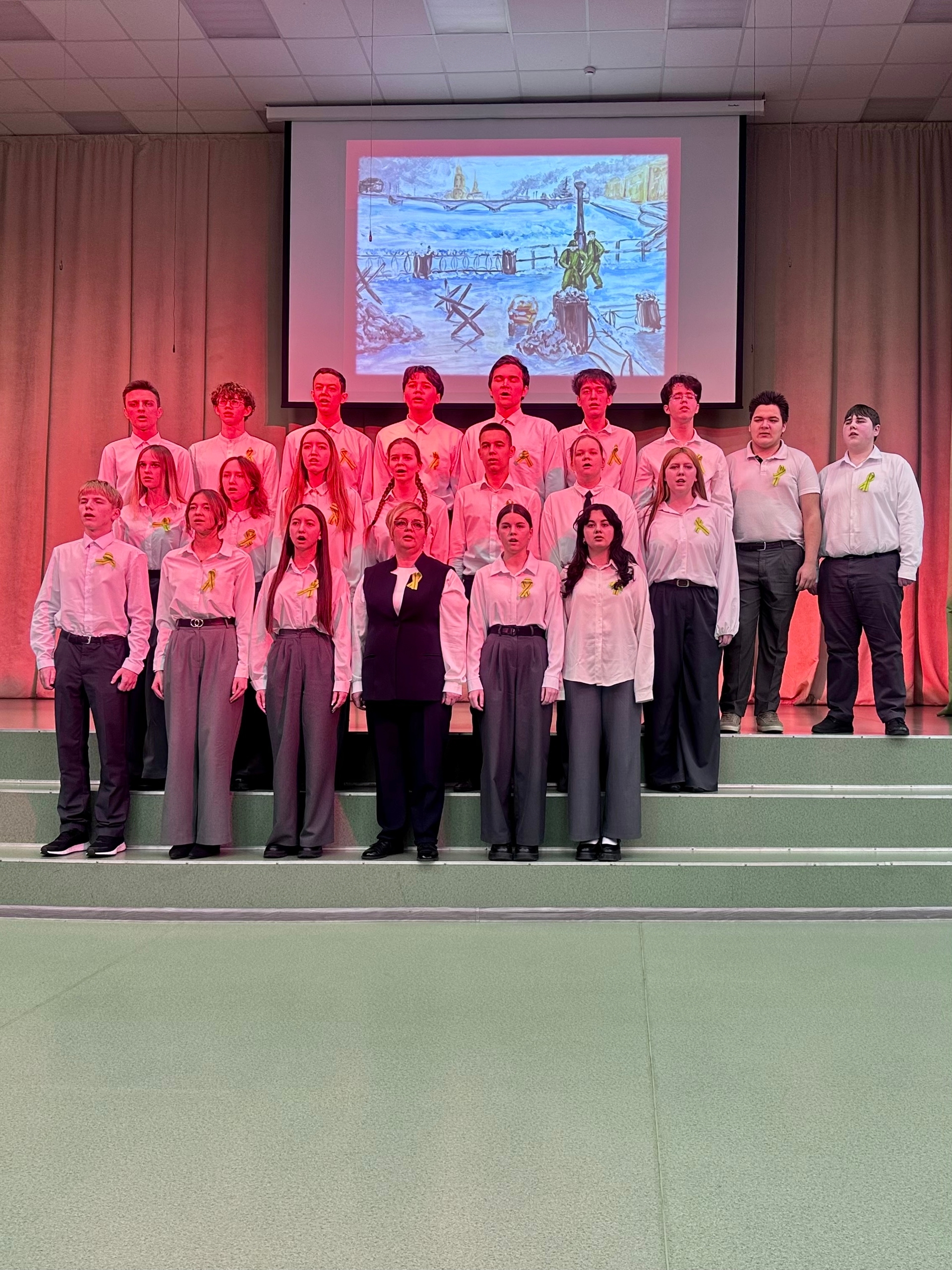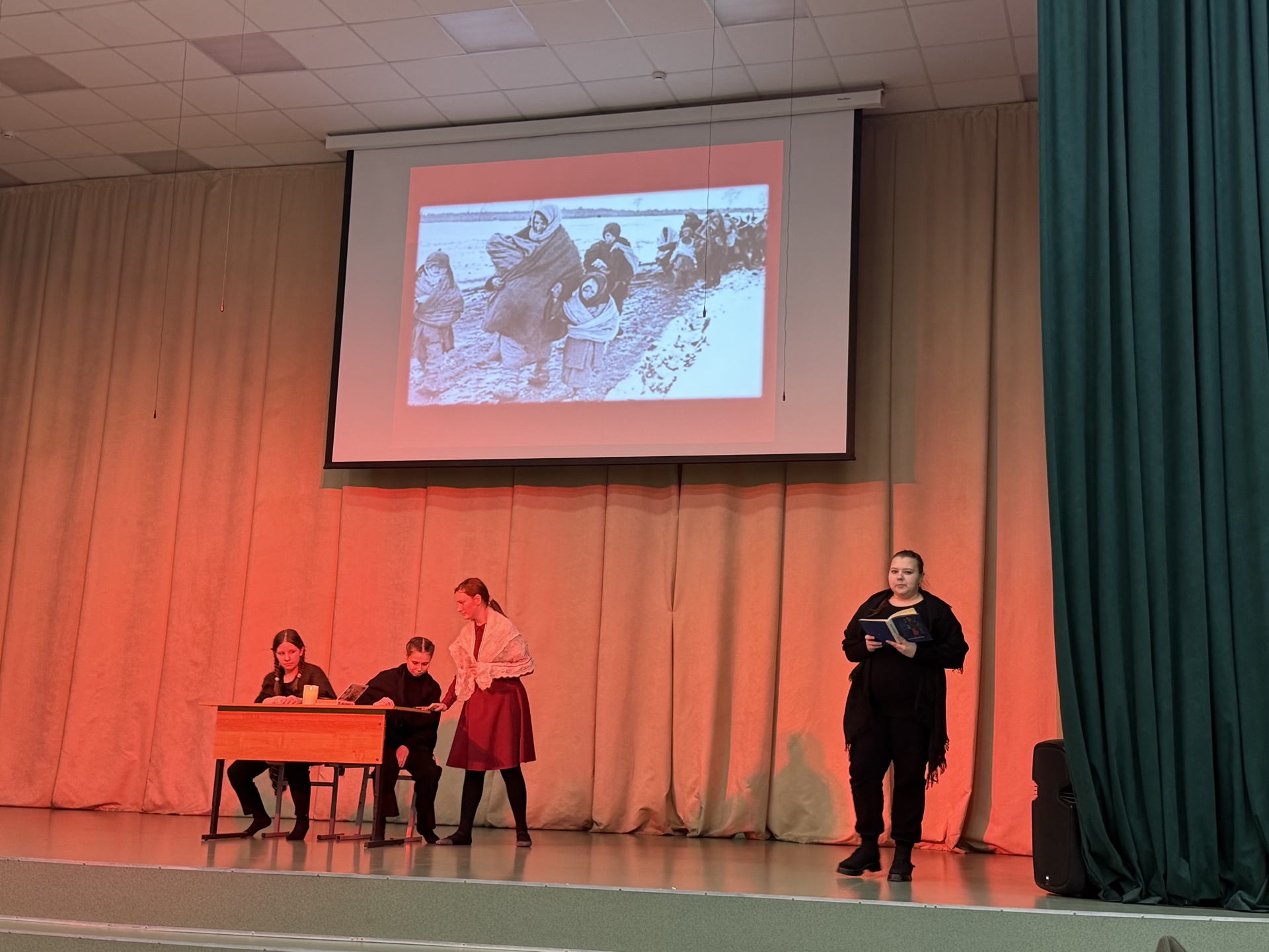 На концерте звучали стихи, песни, творческие зарисовки, посвященные блокадной теме. Яна Тихомирова, член ТИК, вместе с обучающимися Волосовской СОШ №2 Ксензовой Софьей, Луньковой Марией и Ногтоедовой Яной исполнили театральную композицию «Воспоминание из прошлого».